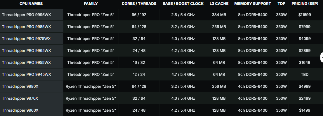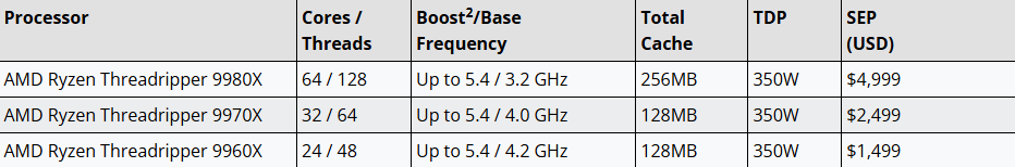Ο Ryzen Threadripper 9970X με 32 cores, 64 threads, 5.4/4.0 GHz και 128ΜΒ στην cache θα ανέρχεται στα 2.499 δολάρια. Ο πιο φθηνός από τη νέα σειρά, θα είναι ο Ryzen Threadripper 9960X με 24 πυρήνες, 48 threads, 128MB cache και 5.4/4.2 GHz στα 1.499 δολάρια.
