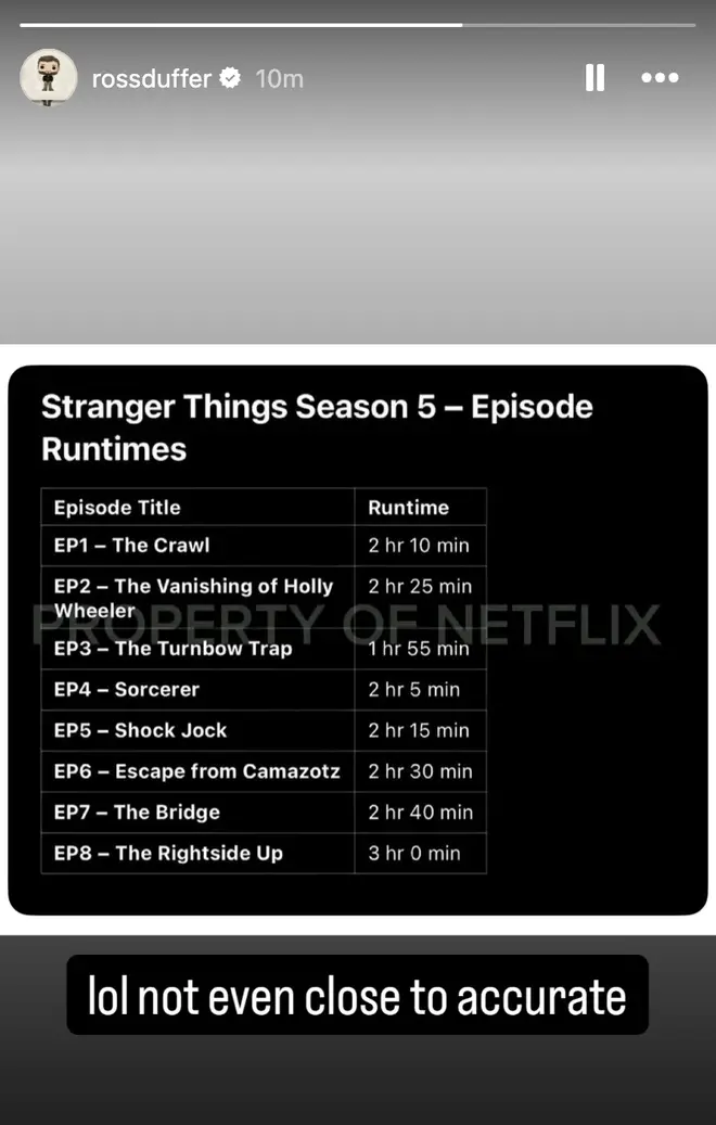 Επειδή αυτή η εικόνα πήρε μεγάλη έκταση, ο ένας εκ των δύο δημιουργών της σειράς, Ross Duffer, πήρε θέση διαψεύδοντας κατηγορηματικά τη διάρκειά τους. Μέσα από ένα Story που ανέβασε στο Instagram, ο δημιουργός του Stranger Things επιβεβαίωσε ότι η εικόνα είναι fake και ότι η διάρκεια των επεισοδίων που αναγράφεται δεν είναι καθόλου ακριβής.